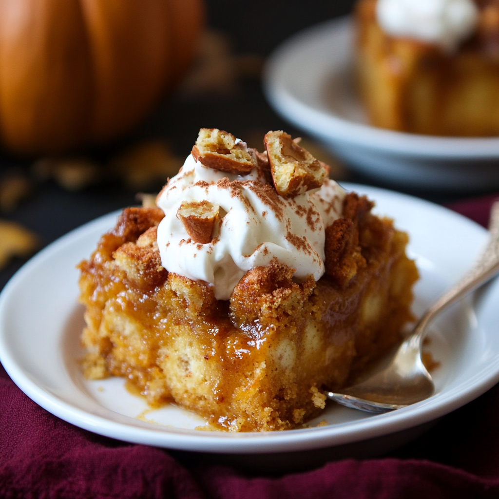 Pumpkin Bread Pudding is a rich dessert made from bread soaked in a spiced pumpkin custard mixture, baked until golden brown.